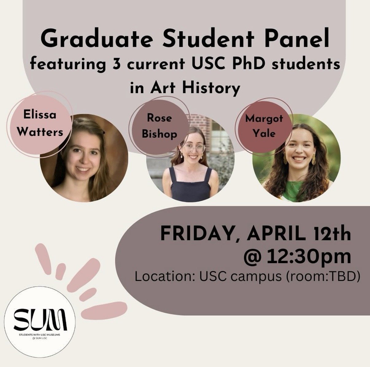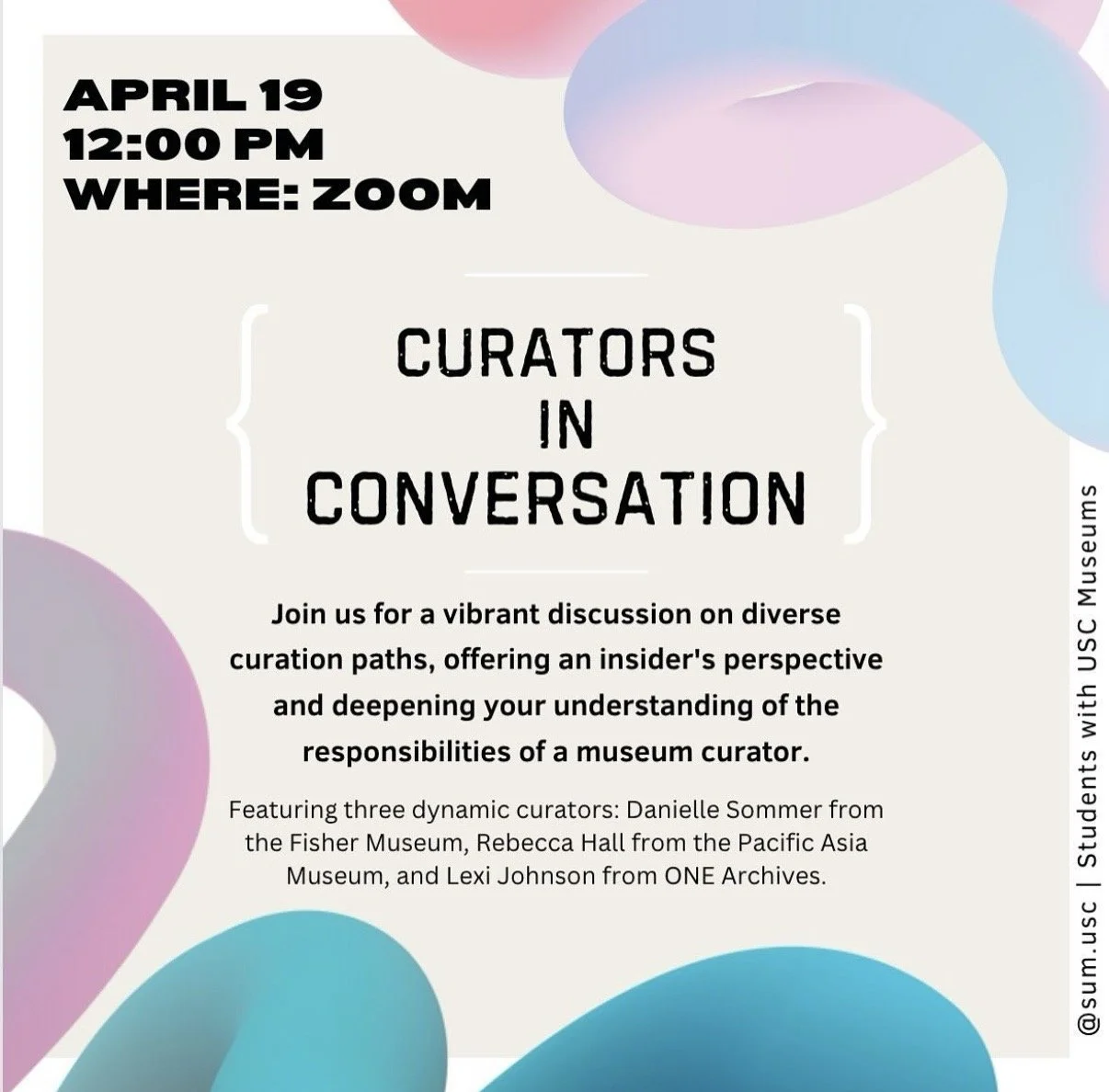 Students with USC Museums (SUM) is a student organization that aims to inspire and educate students about the world of museums by providing opportunities for museum visits, lectures, and workshops. In partnership with the USC Fisher Museum of Art and USC Pacific Asia Museum, SUM offers a unique opportunity to strengthen the bond between USC Museums and the USC student body.