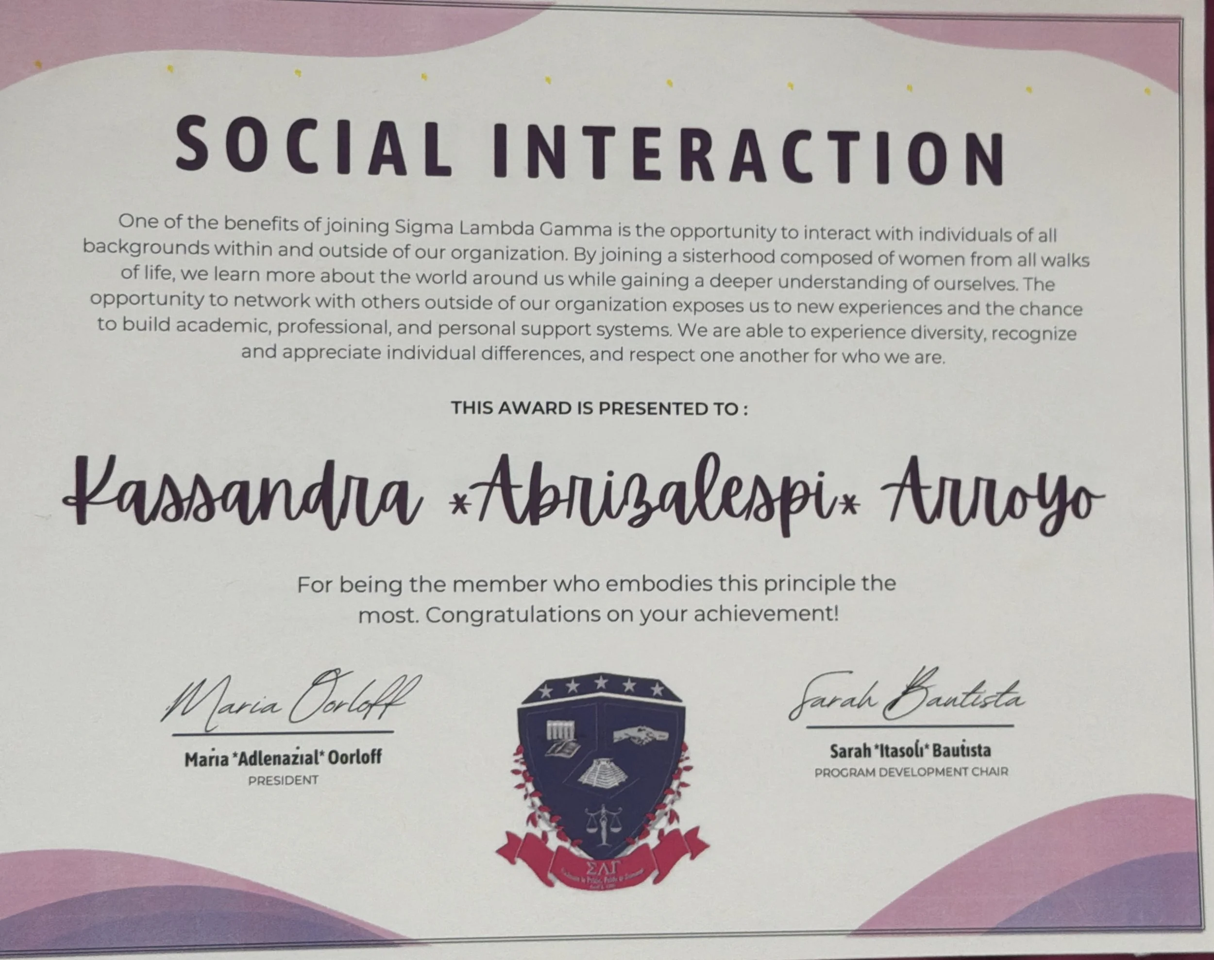 As a proud member of the Nu Alpha chapter of Sigma Lambda Gamma National Sorority Incorporated, I upheld our five founding principles of Morals & Ethics, Social Interaction, Academics, Community Service, and Cultural Awareness. During my undergraduate years, I was VP of Finance, academic chair, and community service chair.